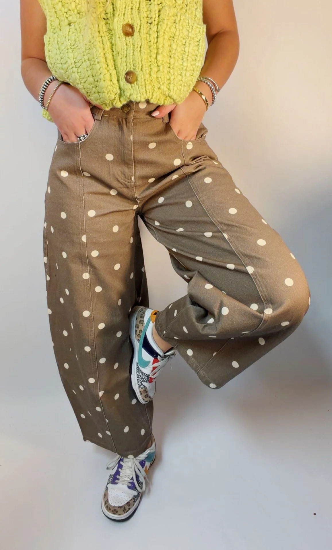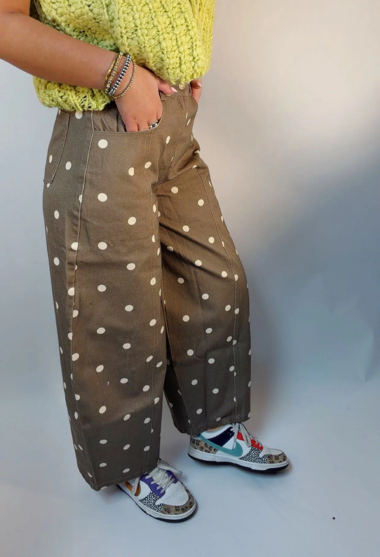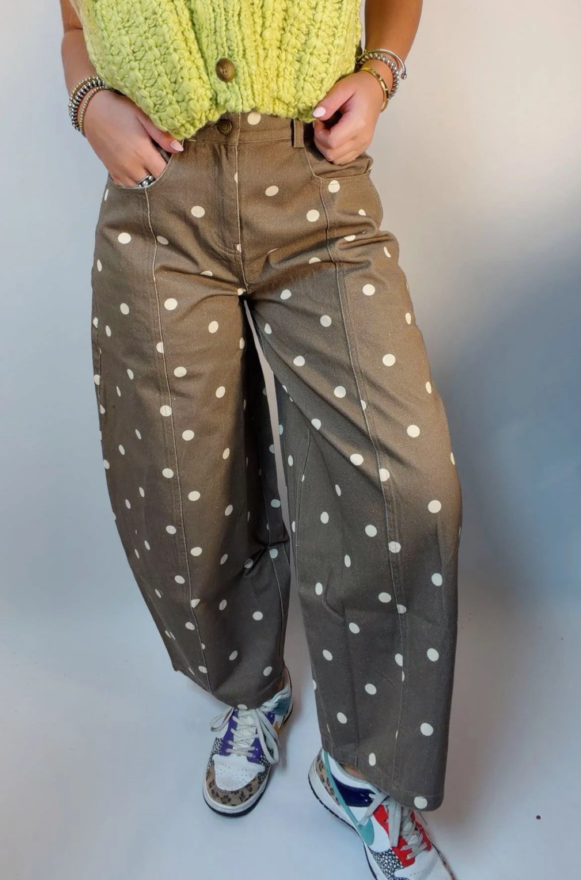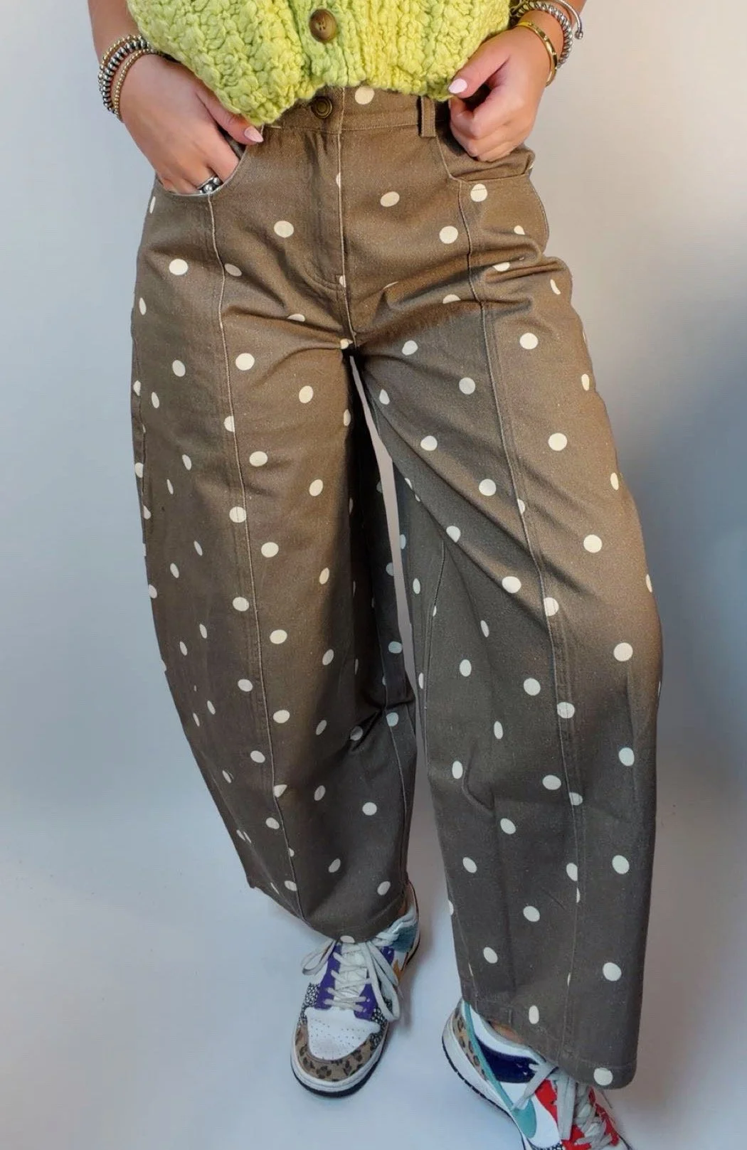 Denim › Brown polka dot pants Image 1 of 4 Image 2 of 4 Image 3 of 4 Image 4 of 4 Brown polka dot pants $72.00 Polk dot balloon pants Model is wearing a size small Size: S M L Add To Cart Added! Polk dot balloon pants Model is wearing a size small
