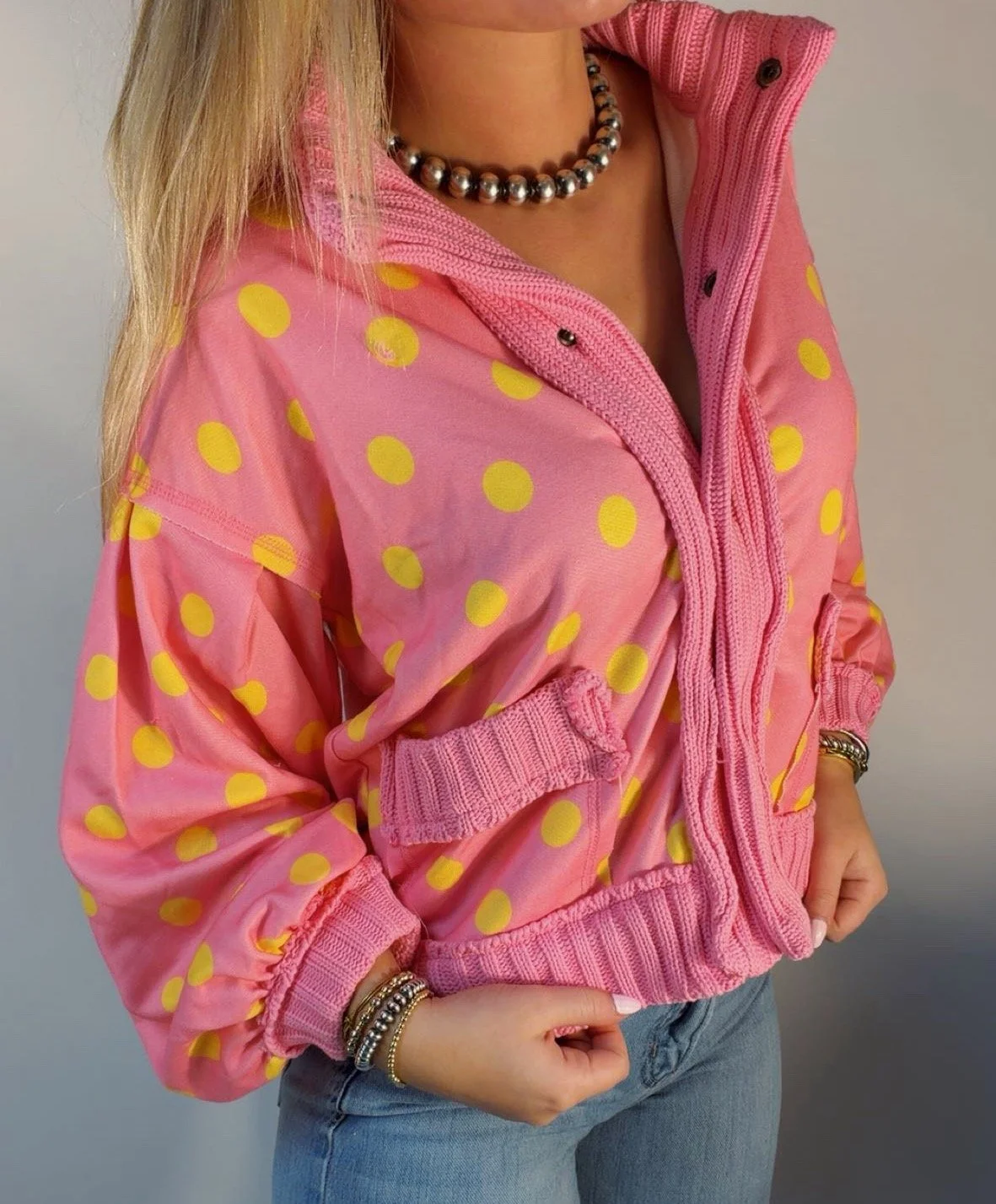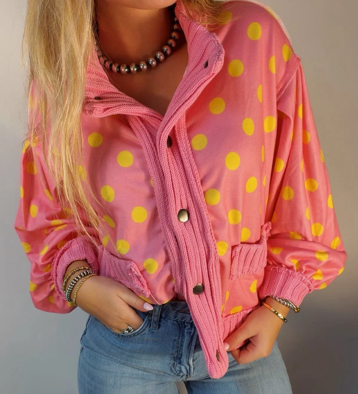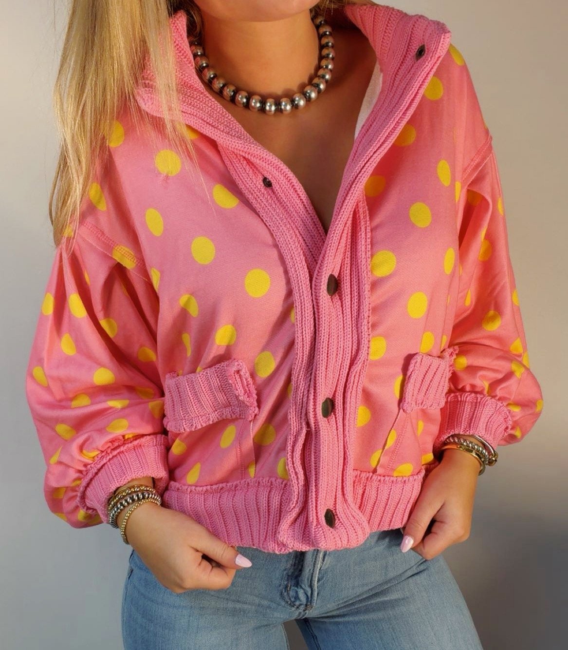 Tops › Polka dot cardigan Image 1 of 3 Image 2 of 3 Image 3 of 3 Polka dot cardigan $60.00 Pink and yellow cardigan jacket Model is wearing a size small Size: S M L XL Add To Cart Added! Pink and yellow cardigan jacket Model is wearing a size small