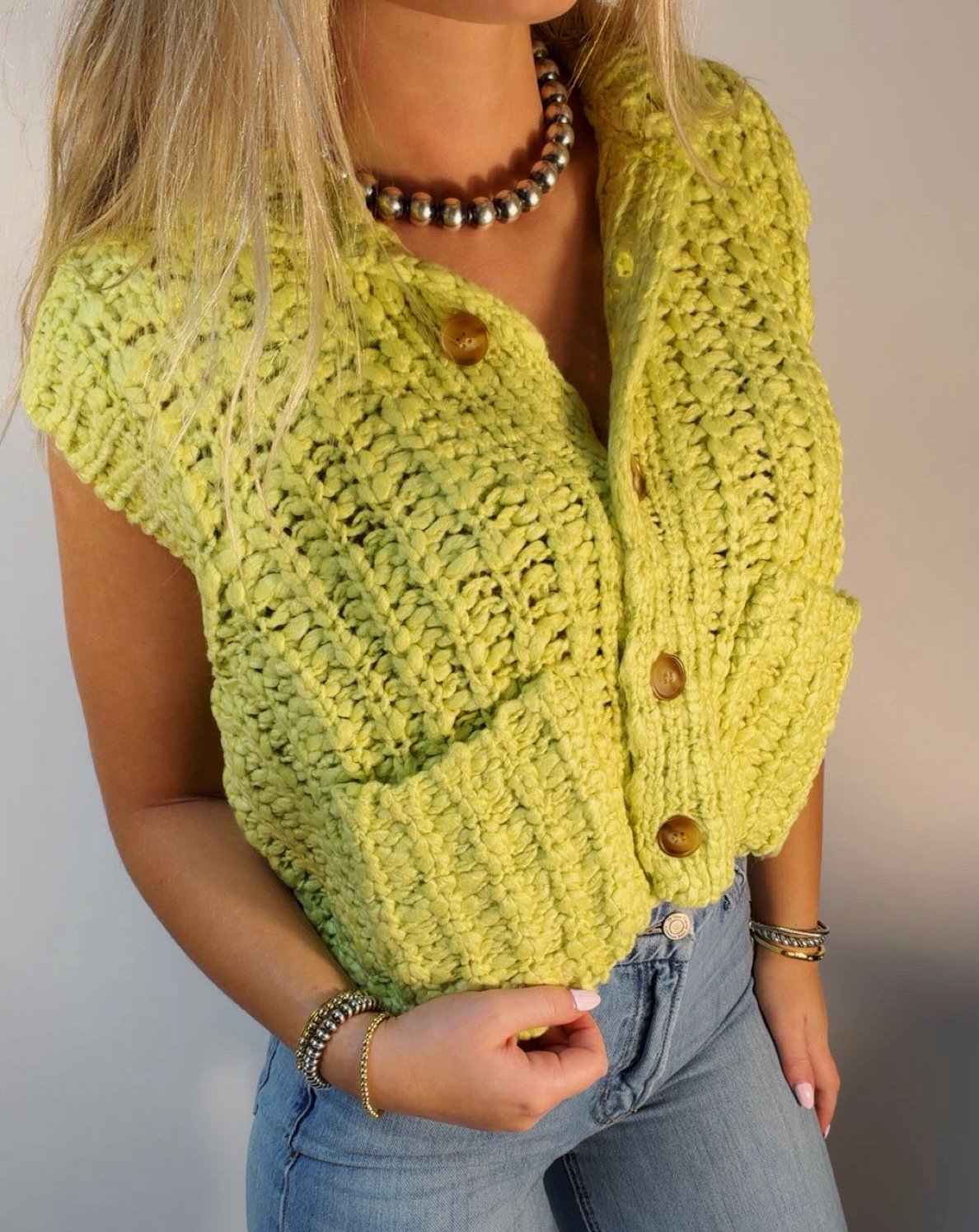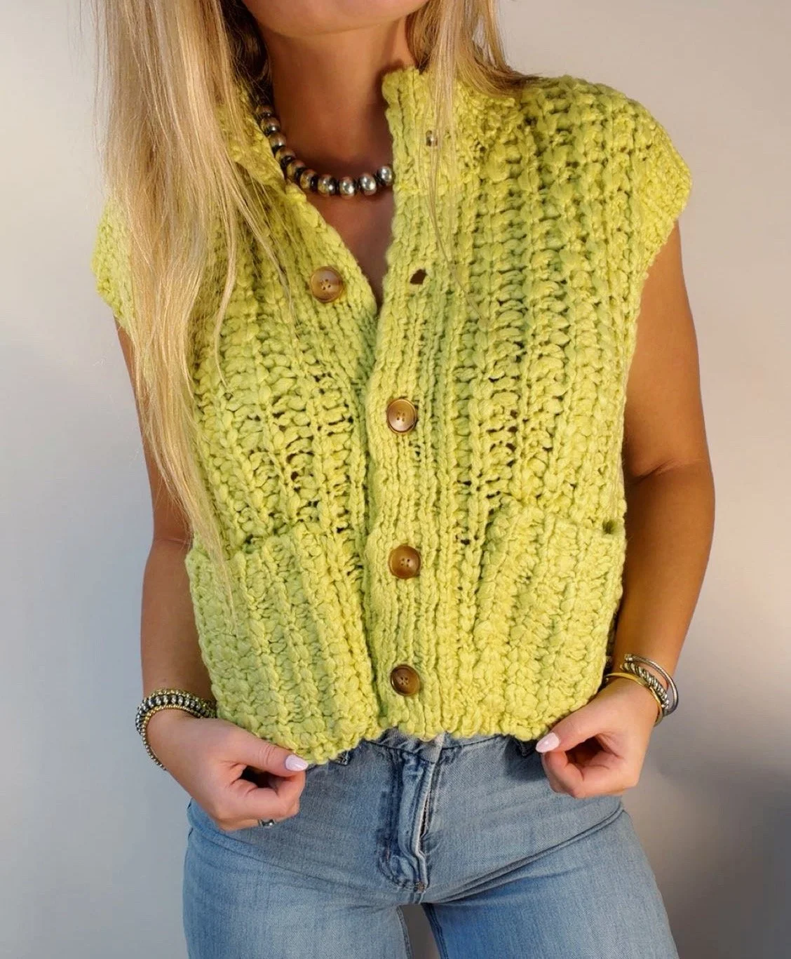 Tops › Chunky sweater vest Image 1 of 2 Image 2 of 2 Chunky sweater vest $50.00 Green button down sweater vest Model is wearing a size small Size: S M L Add To Cart Added! Green button down sweater vest Model is wearing a size small