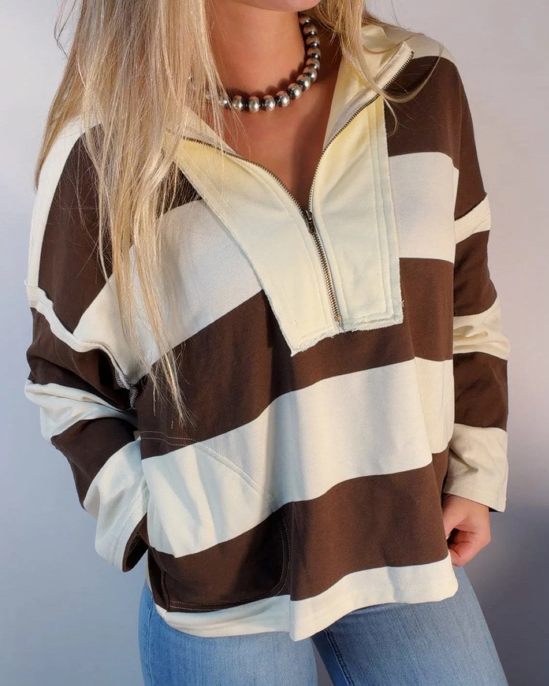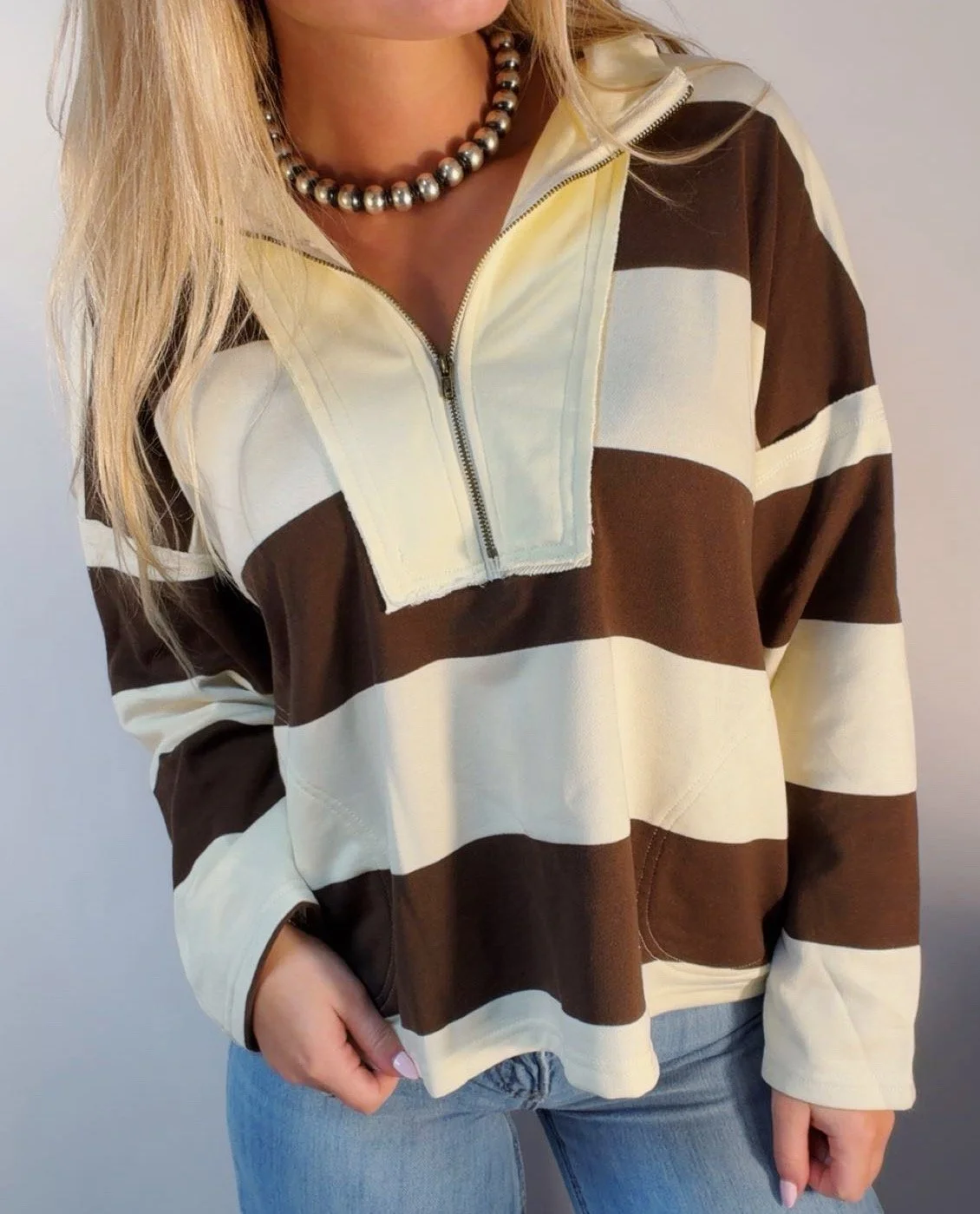 Tops › Quarter zip stripe top Image 1 of 2 Image 2 of 2 Quarter zip stripe top $48.00 Brown and white quarter zip topModel is wearing a size small Size: S M L Add To Cart Added! Brown and white quarter zip topModel is wearing a size small